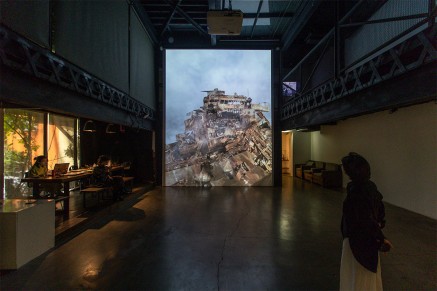 One key element in Niemelä’s recent works are large constructions erected in the gallery, which make the spatial experience extremely physical and poignant. Nostalgia in the Studio gallery is an installation that consists of two animations projected on a large scale and accompanying structural elements. The animations depict an ocean-going ship on stormy seas and how it gradually breaks down. The soundscape consists of a choral piece by Baroque composer Alessandro Scarlatti and ambient music composed by Jaakko Niemelä’s nephew, thus bringing together three generations of the Niemelä family.